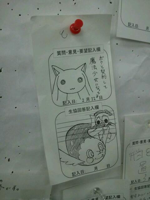 今日の夜はとうとう中断していたまどかマギカの一挙放送日ですね! 真ん中という選択肢は無いのですか? いや無いわけがない!というわけでほむほむ貰っていきます(`・ω・´) PCデスクの下を撮ってみた。 電気火災が起きるとしたら間違い無く私の部屋からだろうなと思ったw さすが生協、アニメネタも抜かりないな。 ってか絵がうめえw ~本日のpixiv~ 東方新作神霊廟から宮古芳香ちゃん! どうみても穿いてないです本当にありがとうございました(*´Д`) 第2段階学科終わり!