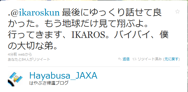 今日は暑かった、とても暑かった、ということで本日もエアコンのスイッチ入れちゃいましたw 東京MXのある番組でフィギュアのランキングがあったみたいなんですが 4位にあずにゃんきた!と思ったら 2位 まさかの1位までw 集計期間の問題もあったでしょうがマジあずにゃん無双www ペロリストは日本経済を救う!(`・ω・´) 明日のハヤブサ帰還に備えついったーでも「はやぶさ帰還ブログ」をフォローしていたのですが、先ほど唐突にこんなツイートが twitter.com/Hayabusa_JAXA/status/16012409015 >行ってきます、IKAROS、バイバイ、僕の大切な弟。 うっ(´;ω;`)・・・うあ゙ぁあ ・゚・(´Д⊂ヽ・゚・ あ゙ぁあぁ゙ああぁぁうあ゙ぁあ゙ぁぁ これだから擬人化は・・・俺が泣いちゃうからやめてくれ・・・本当涙腺弱いな~俺。・゚・(ノД`)・゚・。 ~本日のpixiv~ ついんてついんて! 可愛さが際だちますのうv ~コメント返信~ >>いこさん 所詮ゲームなのにね~普段出来ないことがやれるから楽しいというのに! どうしてこう世の中は規制規制一辺倒なんでしょうね~思考停止した老害の考えることと言うか何というか・・・ とりあえず人生は楽しむ方向で日々を生きてます! これで浪人生じゃなくて大学生だったらもっとエンジョイ出来たんですけどね(;´Д`) 何故去年もっと頑張らなかったんだ(´・ω・`)・・・ |